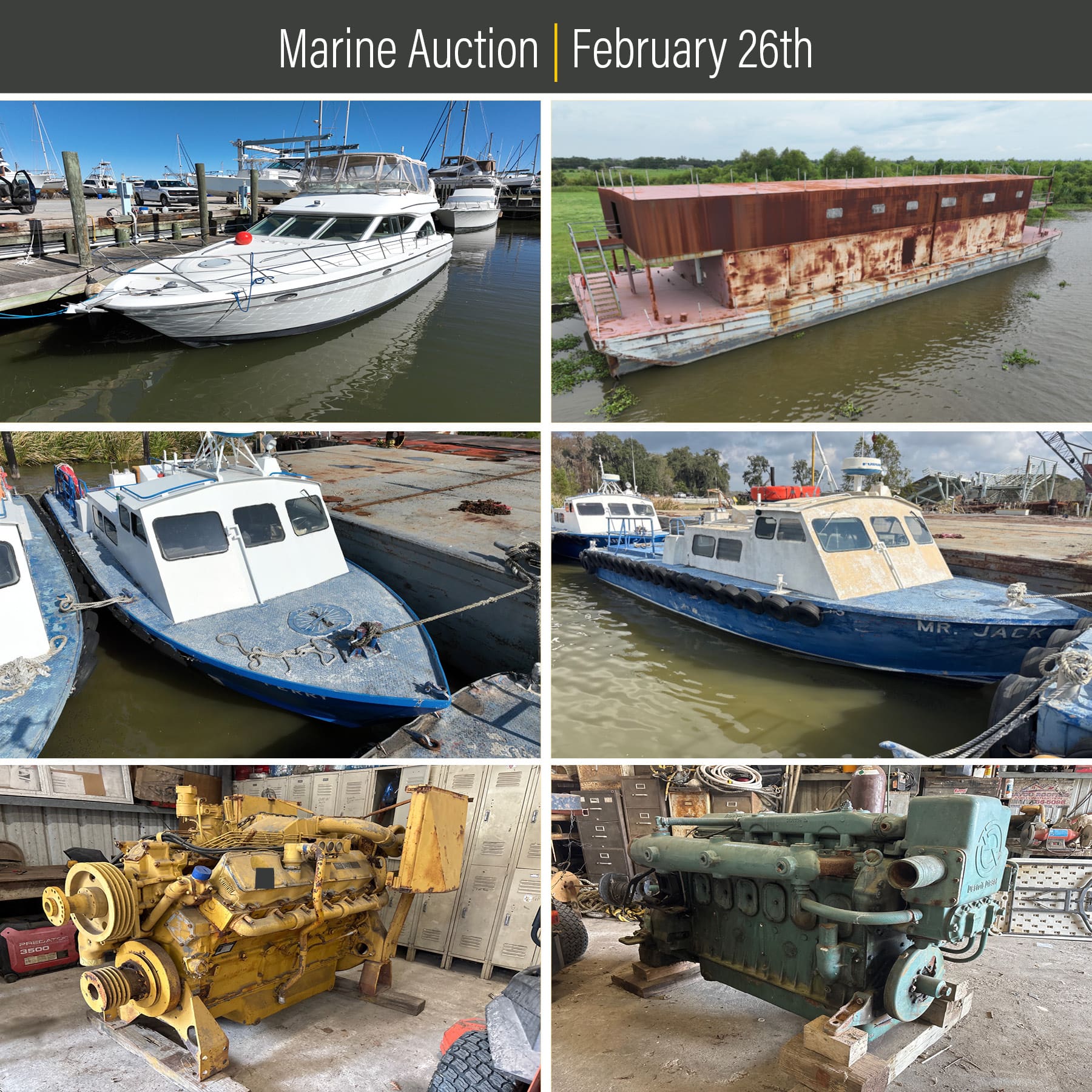 Henderson Auctions has been commissioned to sell surplus vessels, a yacht, and support equipment from a local shipping contractor. Lots will start closing at 11am on Thursday, February 26, 2026. Questions? Call Kurt Sonnier at 225-363-8778 or email kurt@hendersonauctions.com.