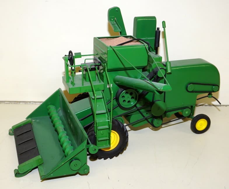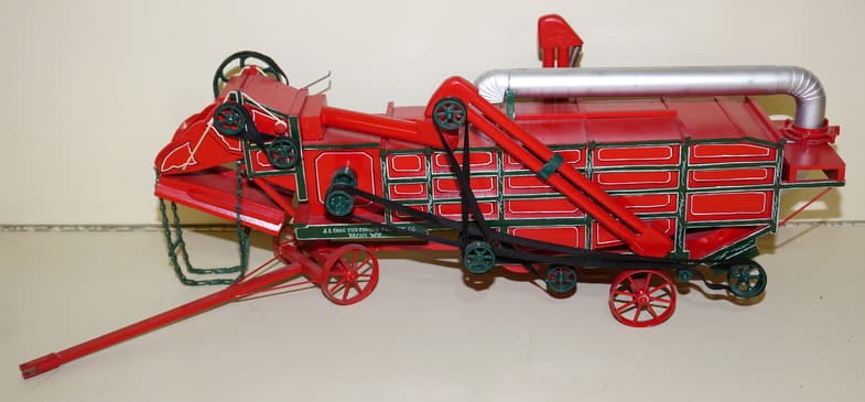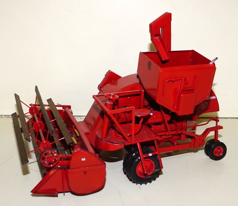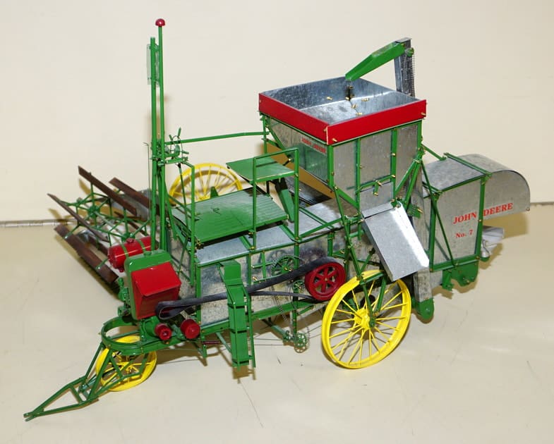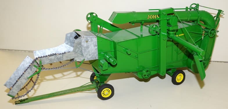 JD Custom Implements: Rouch #7 PT Combine—super nice! Weston Green Threshing Machine-rare; #95 Round-back Combine w/ pickup head; #1700 12r Vert. Fold Planter; Riecke 4b PT Plow on rubber; Wheatland Disc; 4-sec Drag;