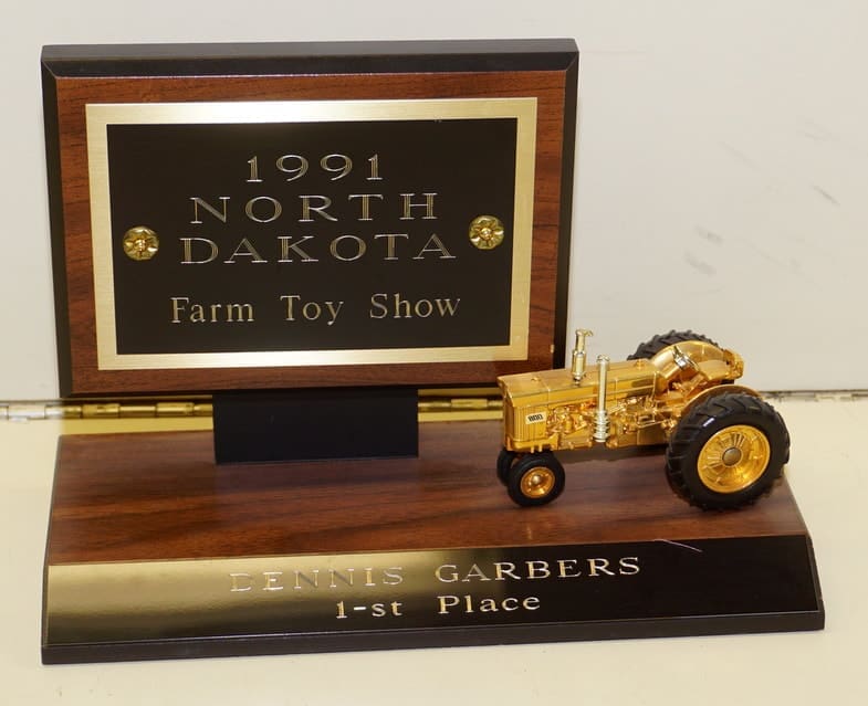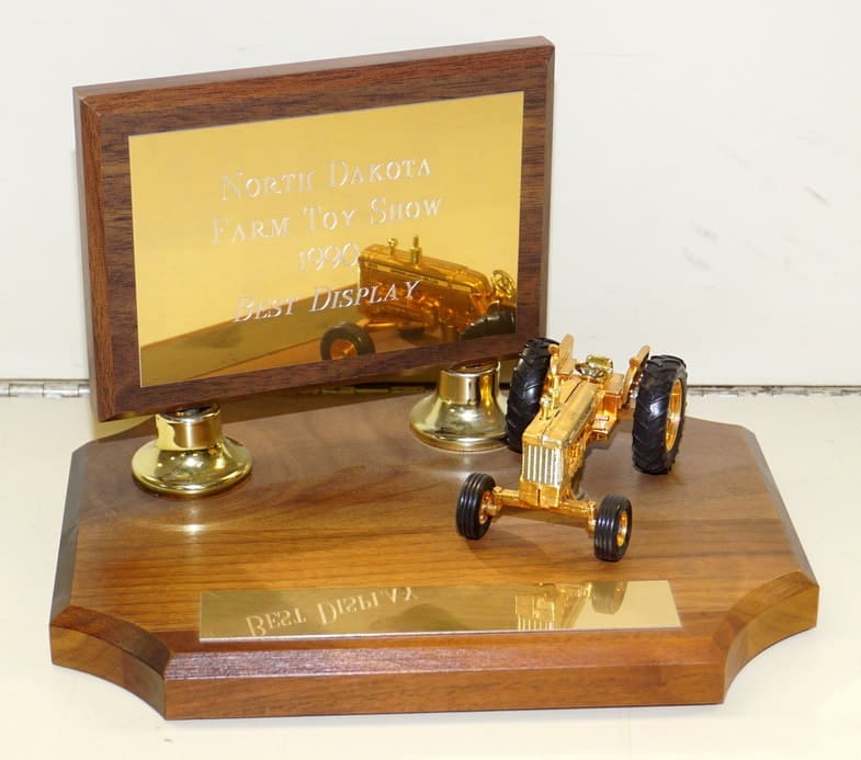 Featured Items: GOLD 1/43rd AC D-19 Toy Farmer on Plaque–’90 ND Toy Show Award & GOLD 1/43rd Case 800 Toy Farmer ’91 ND Toy Show Award on Plaque.