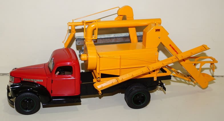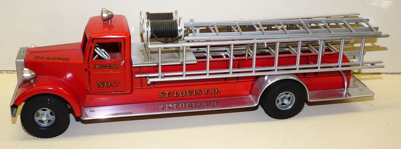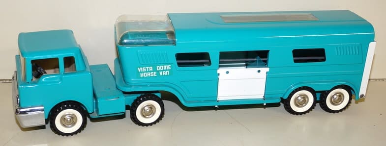 Trucks: M&J Red Peterbilt Semi; M&J Timpte Grain Trailer—super nice! M&J Ford Louisville Straight Truck w/ Knapheide Combo Box-nice; Large Buddy L T-Reproductions IH Red Baby Pickup; Smith-Miller L-Mack w/ Fertilizer Spreader; Smith-Miller MIC Ladder Fire Truck; Nylint Shur-Lock Roll-Tarp Sample Truck; Nylint Versatile Pickup NIB; Nylint DeKalb & Pioneer Seed Corn Semis; Nylint Ford COE Stake Truck w/ Lift Gate; Custom Tonka Ramp-bed Race car hauler; Several Tonka & Structo Trucks & toys; ’57 Buddy L Texaco Tanker w/ box; Marx Large Hi-Way Express Semi; Ralstoy 1959 Co-op Annual Meeting Semi;