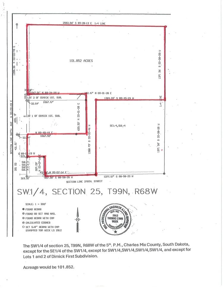 N1/2-SW1/4, sw1/4-sw1/4 less sw1/4-sw1/4-sw1/4-sw1/4 except Lot 1 of Dimick first subdivision, all in section twenty-five, township ninety-nine north sixty-eight west of the 5th principal meridian, Charles Mix county, South Dakota, subject to all easements, right-of-ways and reservations of record