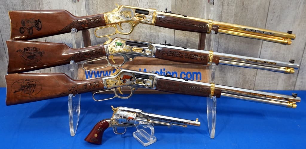 *4 STUNNING ENGRAVED Commemorative Tractor Rifles & Revolver! Includes “Oliver” Heny 30-30 Lever Action #16 of 76; “Minneapolis-Moline” Henry 44 Mag Lever Action #21 of 25; “Allis-Chalmers” Henry 45LC Lever Action #39 of 45; and “Allis-Chalmers” Taylor Uberti 45LC Revolver #39 of 45–All Mint in the box—MUST SEE!!!