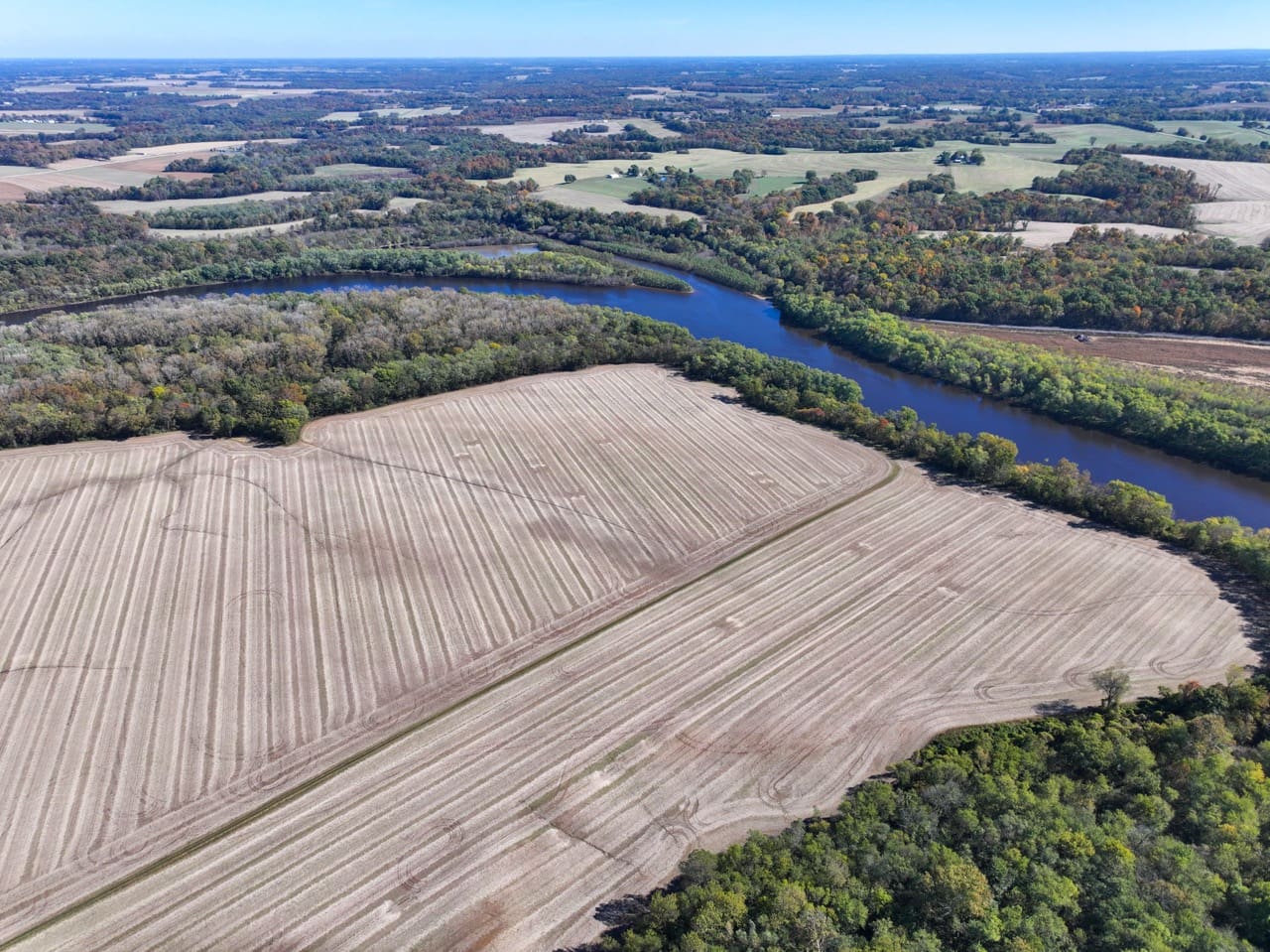 This all-tillable tract offers a great mix of income potential and recreational opportunity in a hard-to-find location. The property features productive crop ground that provides yearly income, while also bordering a large section of state ground for additional hunting and outdoor access. A small pocket of woods sits near the entrance, adding character and providing a little cover for wildlife. The farm has blacktop road frontage with electricity already running back to the site of the old barn, making it convenient for a future home, cabin, or equipment shed. With its gentle lay and open views, there’s a great potential building spot that overlooks the fields and the nearby timber. The Kaskaskia River runs along the edge of the property, offering scenic views and a natural water source. The bordering state ground allows hunting, and with easy access through your own fields, you can enjoy all the benefits of the public land right out your back door.