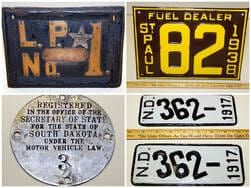 *Plus a fantastic assortment of plates, predominantly South Dakota, North Dakota, & Minnesota. This includes leather plates, dash discs, early plates, low numbers, dealers, motorcycle, samples, Governor’s, Highway Patrol, Sets, runs, errors, tribal, duplicates, & so much more! Best of the best!