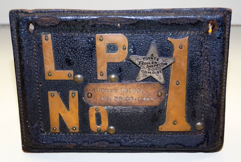 *1905 MN LEATHER Plate #1 from Long Prairie Township, St. Peter, MN! Beautiful leather plate with copper letters and owner’s original badge—he was the state boiler inspector!