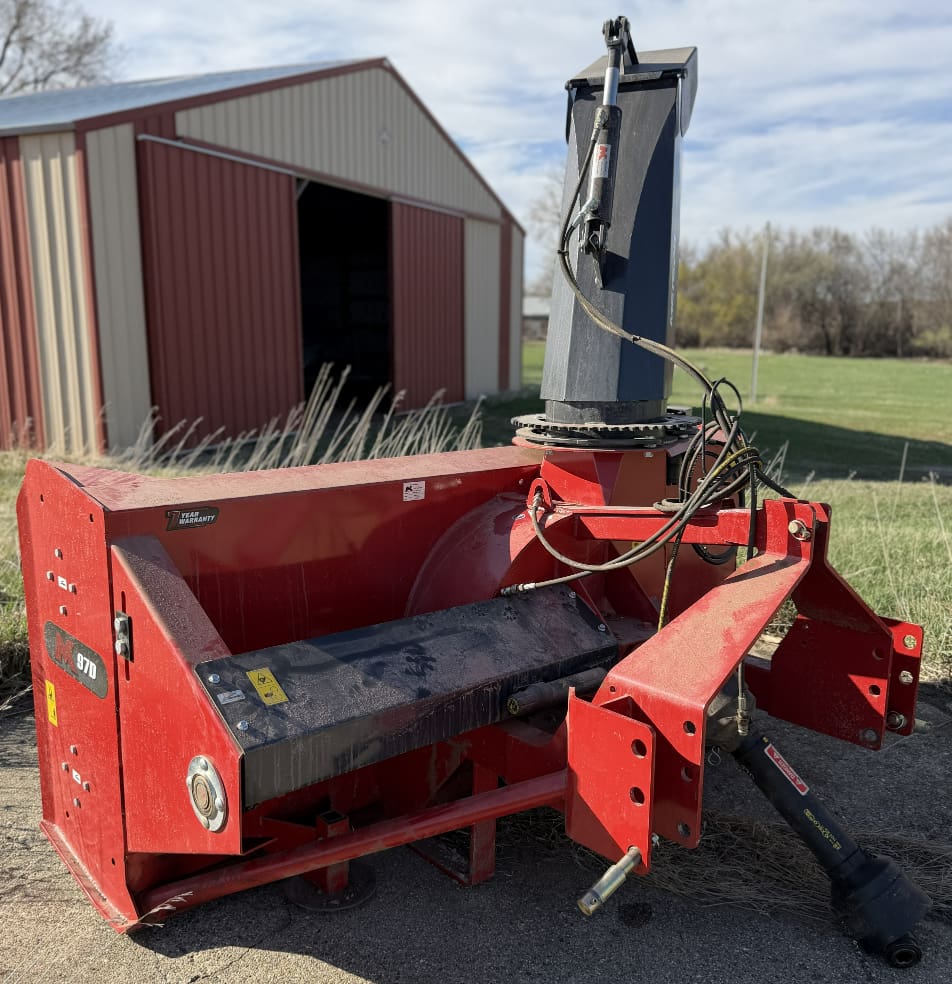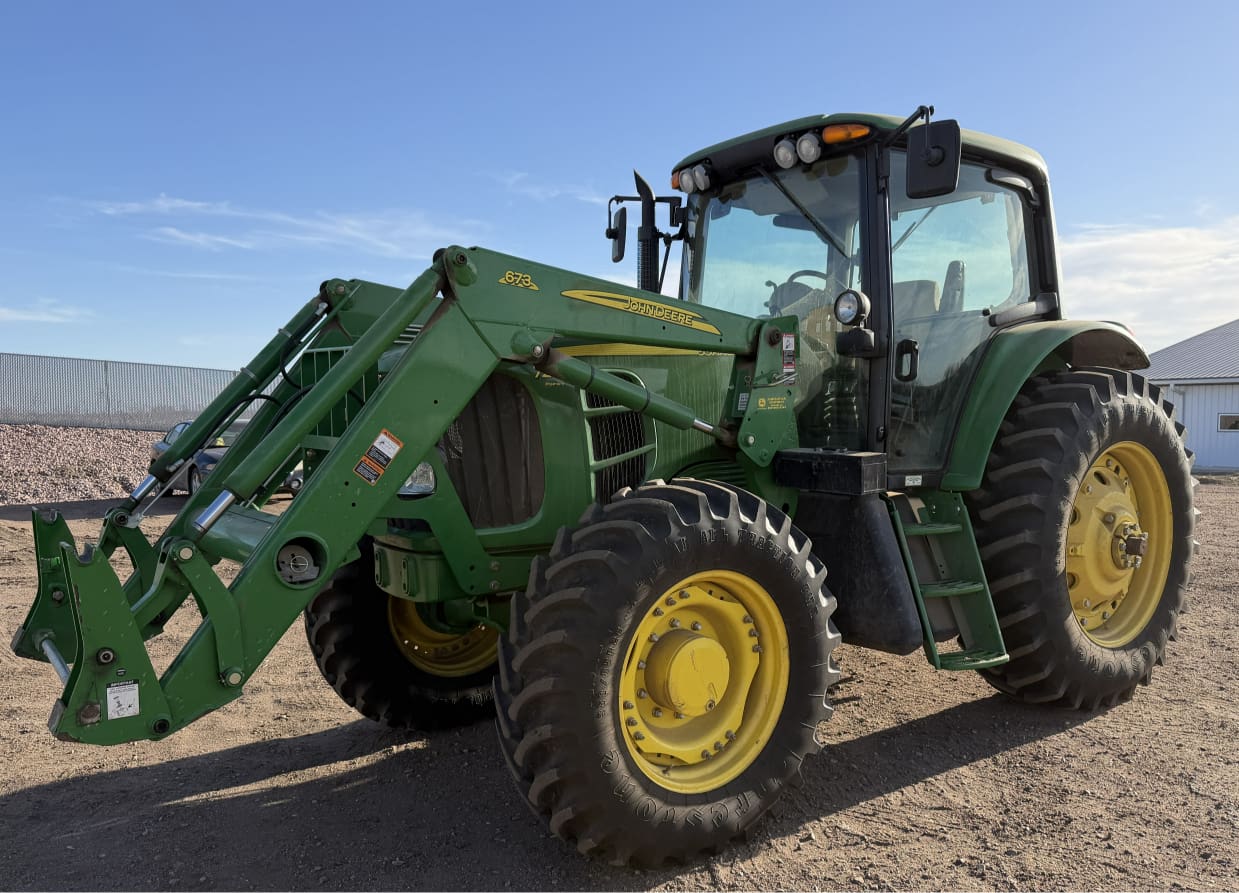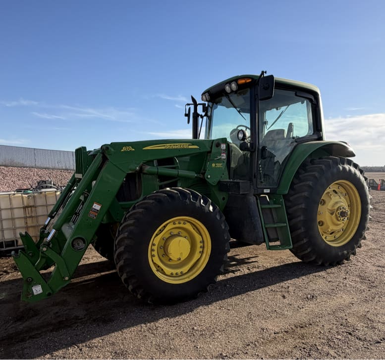 JD 7230 PREMIUM TRACTOR & ATTACHMENTS: 2011 JD 7230 Premium MFWD Tractor w/ JD 673 Loader, 8’ Bucket, Buddy Seat, 16 Spd. Power Quad Trans., Left Hand Reverser, 18.4R38 Rear Tires, 14.9R28 Frt. Tires, 540/1000 PTO, only 600 Hours, SN: RW7230H025516 – Exc. Cond.; 2023 Meteor 8’ Mdl. SB97D-R Snowblower, 540 PTO, Twin Beater, Exc. Cond., SN: K0885; Bush Hog Squaler 7’ 3 pt. Mower; MDS Single Prong Bale Spear, used on JD 673 Loader;