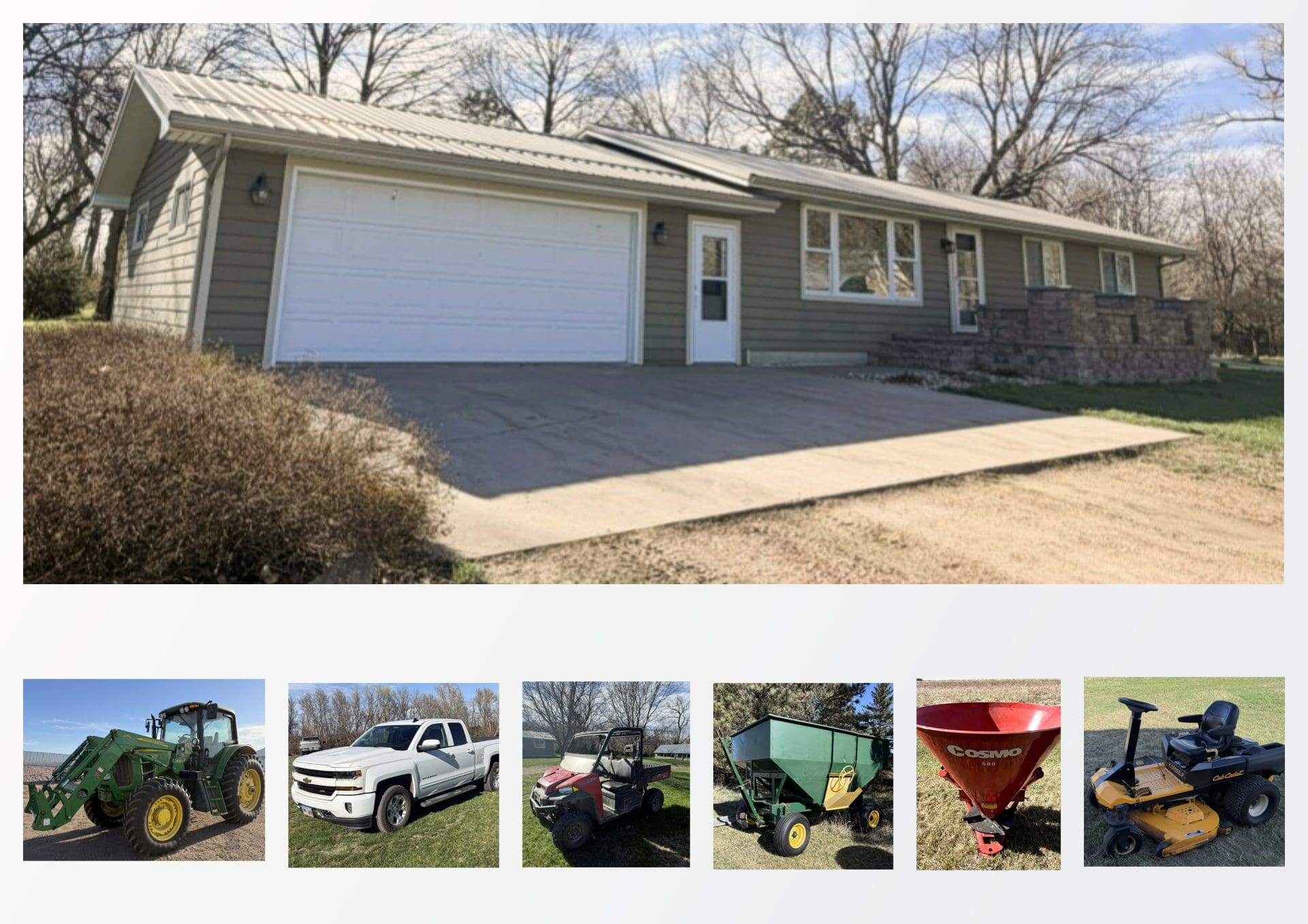 +/-13.83 Acre Surveyed Acreage with Very Well Maintained 3 Bedroom Ranch Style Home Situated in a Pleasant Private Country Setting conveniently located between Baltic & Sioux Falls, SD! Personal Property including a 2011 JD 7230 Premium Tractor w/ only 600 Hours, 2023 Meteor 9’ Snowblower, a 2019 Chevy Silverado 1500 Pickup with only 12,560 Miles, 2018 Polaris XP 900 Ranger, Cub Cadet Z Force S54 Lawn Mower, Lawn & Garden items, Shop Items & Tools, Antiques & More! Consigned items including a 2014 JD H160 Loader, JD #503 & Bush Hog #720 3 Pt. Mowers, Very Nice New Ida #314 2R Picker, Bradford Gravity Wagon, Very Nice JD 3 Row Adj. Planter, 3 Pt. Disk, Plow, & Tree Cult., & other Acreage Equipment!