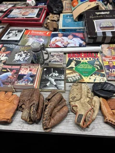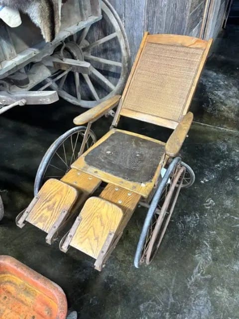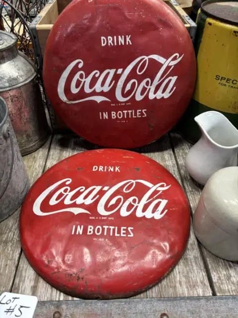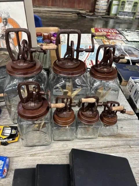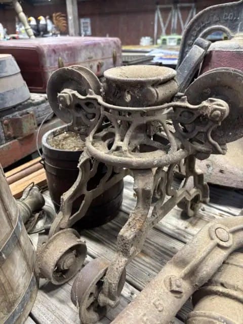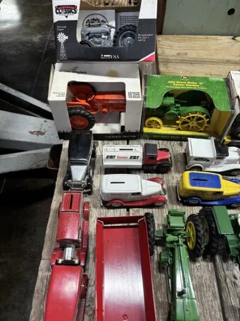 Vintage scales, several vintage Tonka toys, various reproduction signs, framed World War I posters, 1930s Quaker State motor oil advertisement, various crocks and stoneware, two sets of Longhorn horns, feed scale, homemade Tractor seat chair, hay trolley, dinner bell with stand, vintage oil cans, antique wheelchair, various sports memorabilia, including vintage baseball gear, such as bats and gloves, various clocks, advertising calendars, several peanut jars, various butter churns, various farm toys, Coca-Cola button signs, green depression glassware, baby cradle, lots of marbles, old license plates, vintage fishing gear, including lures, tacklebox traps and poles, horse drawn sled, various alcohol advertisements, pedal plane, NU grape light up clock (does work), DX motor oil clock (does work), Allis Chalmers clock (does work), Allis Chalmers light up sign (does work), old Shay beer clock (does work), lawyers cabinet, several pocket knives, black powder double barrel, Authentic signs