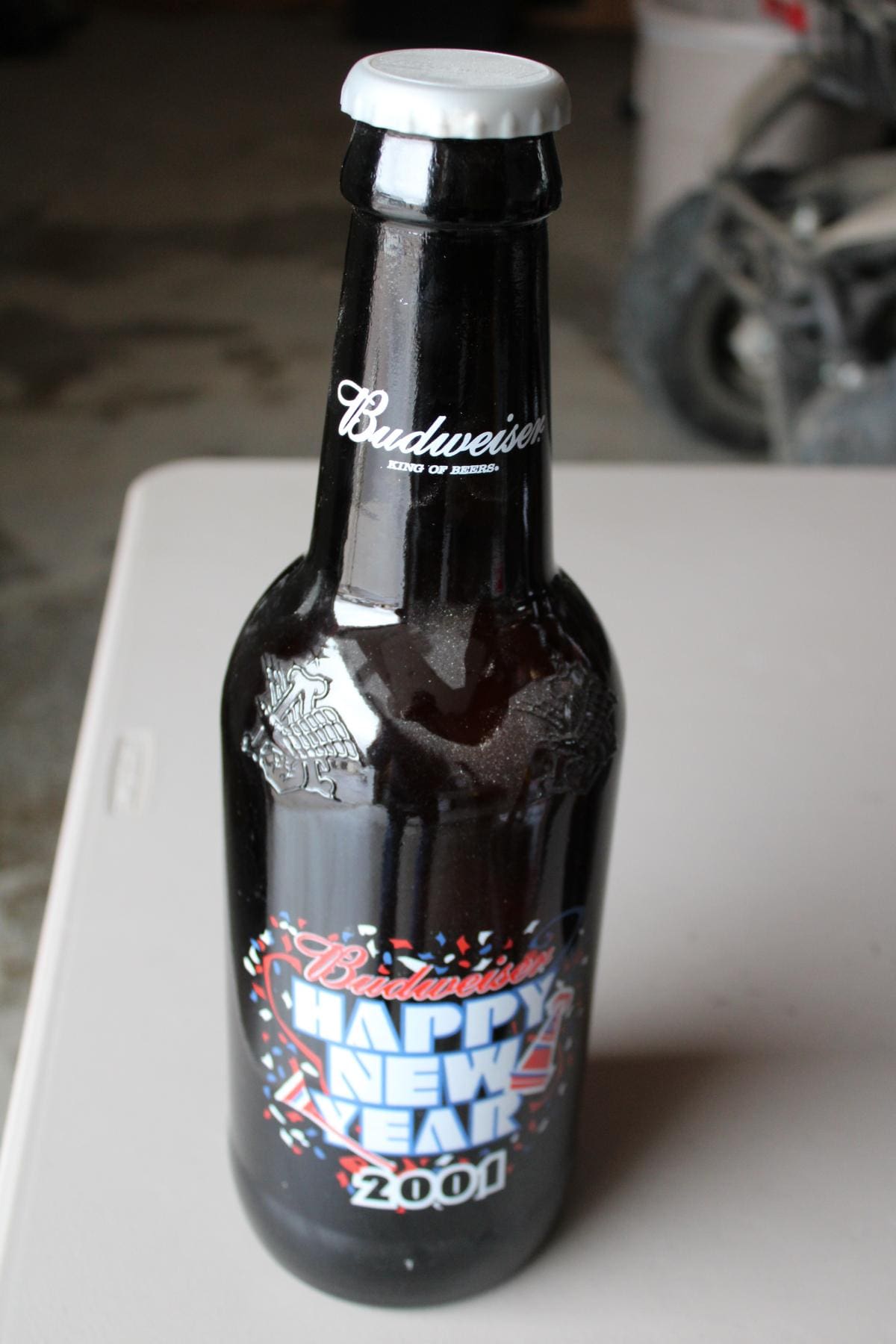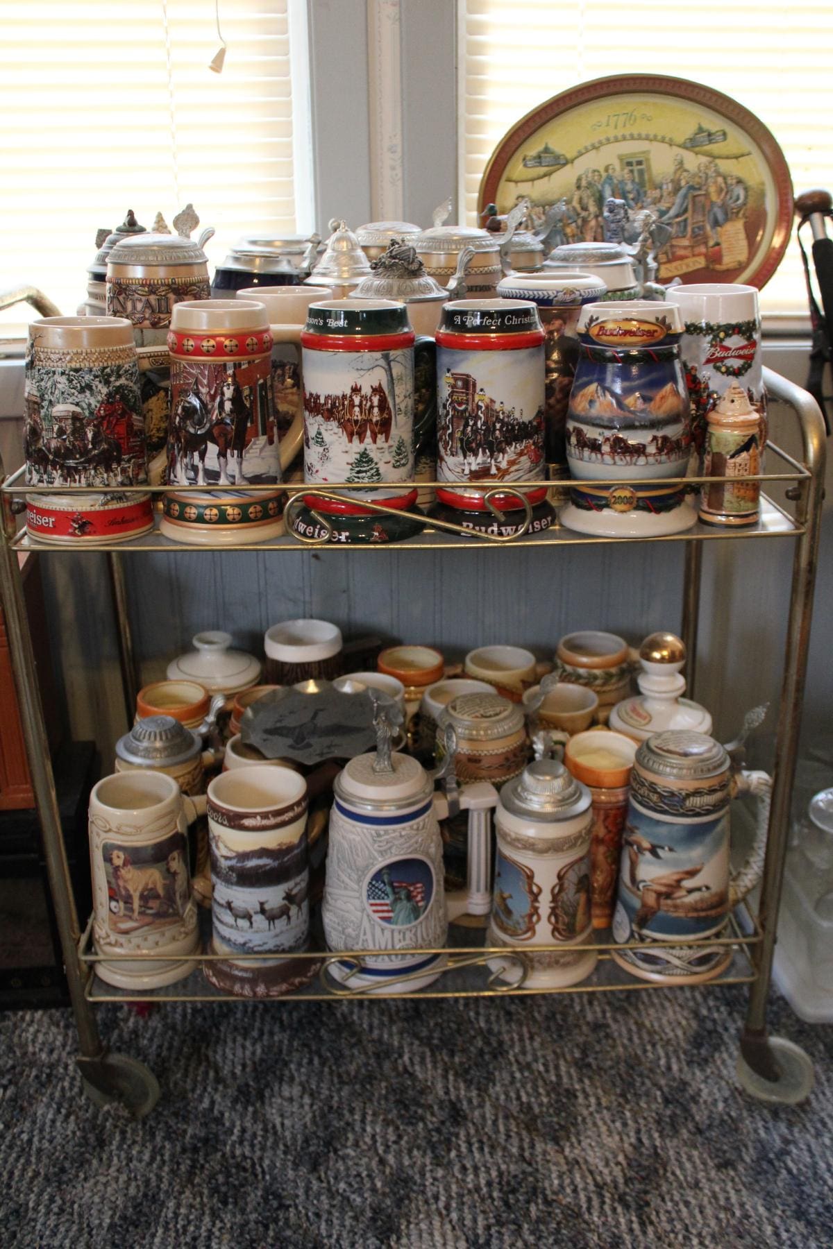 BEER MEMORABILIA: Lited Budweiser Clock; 3’ Lighted Bud Light Beer Light; 2 Heileman’s Special Export Beer Lights; Blatz Beer Light; Walderof Beer Sign; Hamm’s Beer Light – Not Working; Michelob Beer Bottle Bank; Beam Space Shuttle Decanter; 2 Golf Car Decanters; Date w/Destiny Decanter; DU Decanters; Approx. 50 Beer Steins – Budw., Coors & DU; 15” Budw. Beer Bottle;