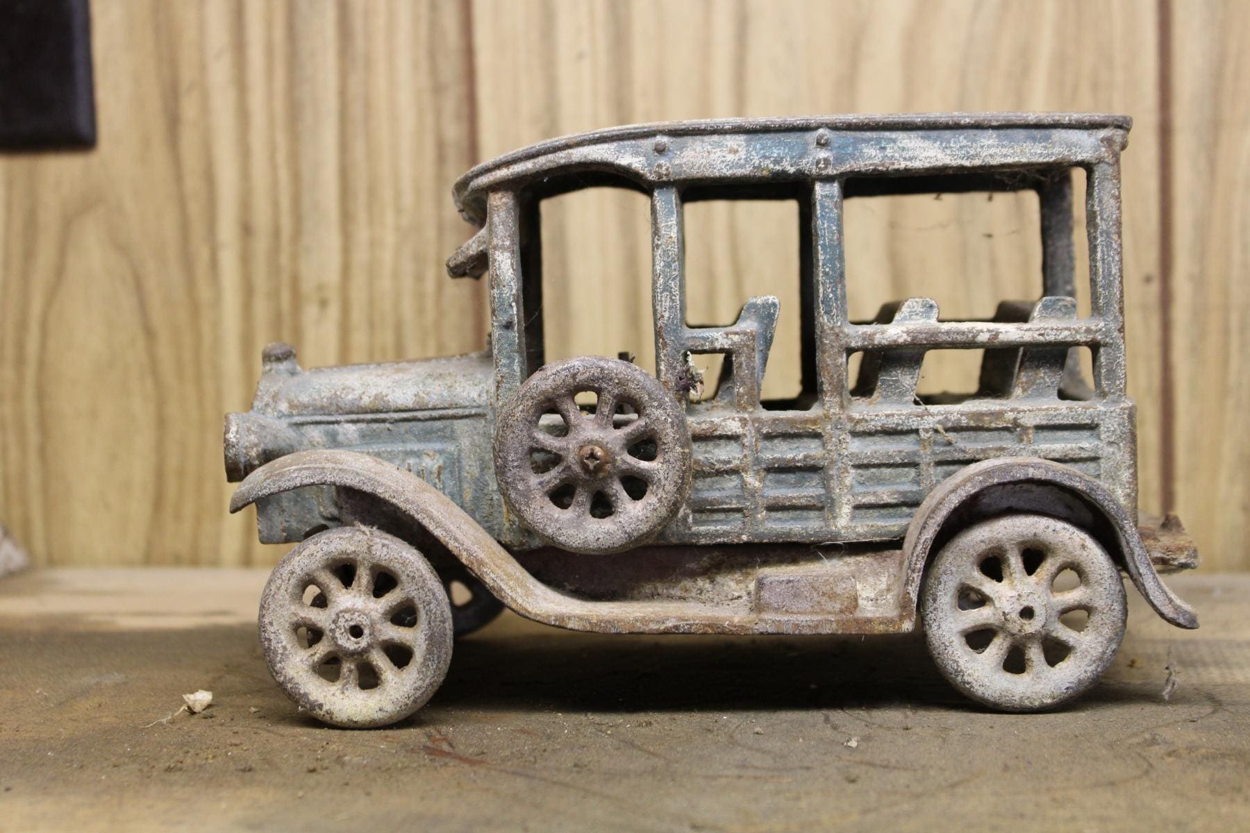 CAST TOYS: McAllister IH 1907 Gen. Mercantile Wagon; Tootsie Toy 236 Mail Truck w/Steel Wheels; Horse Drwn. Purelake Ice Wagon w/Horse; Model T Woody Ford Sedan Bus/Taxi Car; JD Tractor; Carriage; Cast Truck.