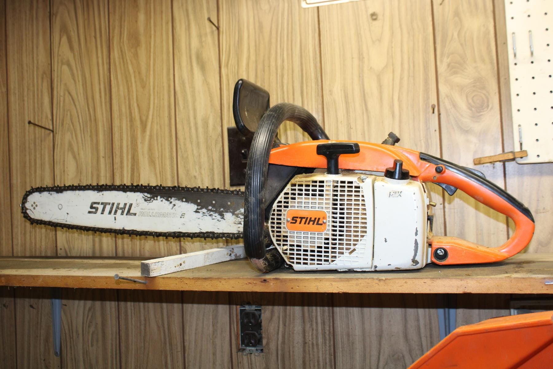 SHOP ITEMS, YARD & GARDEN ITEMS: Craftsman 10” Band Saw; Bench Top Drill Press; Companion 10” Table Saw; Grinder on Std.; Sanborn Magna Force 4HP Air Compressor; Skil Belt Face Plate Sander; Machinests Vise; Miter Saw on Std.; Werner 18’ Alum. Ext. Ladder; Werner 6’ Fiberglass Ladder; 26” Buzz Saw Blade; Clamps – NIB; 4’ Work Bench; 6/12V Battery Charger; 2T Floor Jack; Chain Hoist; Bell System Stanley Axe; Hand Tools; Levels; Nuts, Bolts, Nails; MTD Snowflite 5/24 Snowblower; Stihl 041 Boss Farms & Stihl 042A Chainsaws; Mighty Mite Chainsaw; 3 Leaf Blowers; Yard & Garden Tools; 2 Wheel Yard Cart;