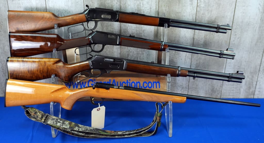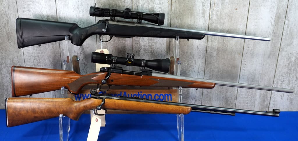RIFLES: WINCHESTER – M.63-High Grade 22LR; M.70 XTR FW .30-06; (4)M.70 .25-06, .30-06, (2).300WM; M.Xpert Sporter .21 Sharp, NIB; (2)M.94 .30WCF, 30-30; (2)M.9422M XTR .22WinMag; M.94AE .357, NIB; M.1890 22Short; M.190 22cal; M.62A 22cal; M.1906 22Short; M.06 22cal; M.67 22cal; M.72A 22cal; M.72 22short; M.77 22cal; M.63 22LR; M.61 .22cal BROWNING –M.A-Bolt 7mmRemMag; M.X-Bolt Max .308win; M.BAR .270, scope, Belgium; (2)M.T-Bolt .17HMR, .22Mag Varmint BBL; M.T-Bolt Target 22WMR, NIB; M.SA-22 22LR, Belgium; M.BA-22 22LR; REMINGTON – M.700VTR .223rem; M.722 .222Rem; M.788 .243 NIB; M.14 .32 Rem; M.770 .270win; M.511 SM .22cal; M.6 .22cal; M.12A 22cal; (2)M.24 .22Short; MARLIN – M.1894 .44RemMag; M.336 R.C. .30-30; M.336 .35Rem; M.25M 22WMR; M.795 22LR, Camo; M.70P 22LR Papoose Take-Down, NIB; M.92 .22cal; M.60 22LR; Ranger M.36 .22cal; RUGER – Talo M.10/22 22LR Eagle, Tiger & Wildhog, NIB; Ranch Rifle .223rem, Folding Stock; Ranch Rifle .223: (2)10/22 22LR, NIB; American LH .308; American “Farmer Edition” 22LR, New; 10/22 22LR Youth, NIB;10/22 LR Custom Build; HENRY – Big Boy 44RemMag L/A; M.H027-H9 9mm auto; M.H004V .17HMR GB; M.H004 22LR GB, NIB; M.H001V .17HMR; SAVAGE – M.100 .300WSM; (2)M.110 .358win & .30-06; (2)M.B-Mag .17Win Super Mag; (2)M.A-17 17HMR & 17Mach2; M.93 22WMR Varmint; STEVENS – M.Junior 22cal; M.14-1/2 Little Scout .22cal; (3)Favorite M.1915 22cal; Junion M.11 22cal; THOMPSON/CENTER – Encore Pro-Hunter .243win; Contender .30-30 Win; WEATHERBY – M.MarkV .25-06; Vanguard Sporter .22-250 NIB; ROSSI – Puma M92 .357mag; (2)M.R92 .357mag; Rio Bravo .22cal; STOEGER – M.66 Sporting 45Colt; (2)M.1873 357mag, 45LC; Silver Boy 22LR; TIKKA – (2)M.T3 .25-06 & .223rem; OTHER –CHRISTENSEN ARMS M.14 6.5PRC, Leupold, Carbon BBL; PARKER-HALE Ltd. M.1200 Super .270; BERGARA M.BXR 22LR, Carbon BBL; MOSSBERG M.42A 22cal; DUMOULIN HERSTAL .30-06 B/A; SEARS M.54 .30-30; HAMILTON No.51 22cal; HERITAGE M.92 Ranch Hand 357Mag Mares Leg L/A Pistol; BERETTA M.Gold Rush 357mag, Colt Lightning Clone; CIMARRON M.1873 357mag; TAURUS M.C45 45colt, Nickel;