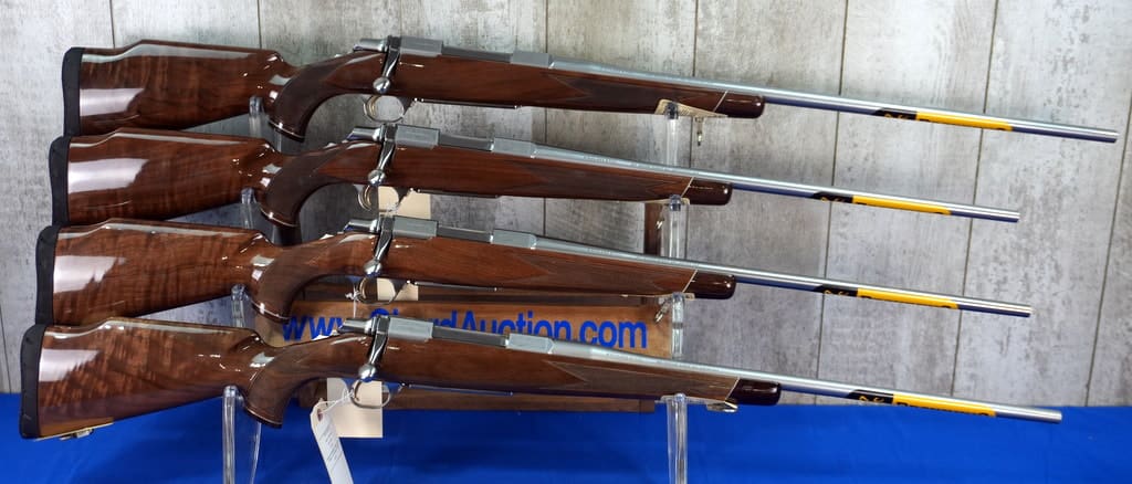 HIGHLIGHTS – BROWNING RARE Set of (4)A-Bolt White Gold Medalion in .264 WinMag, .257 Rob., .260 Rem, 6.5x55mm, set only 1 of 50mfg. in 2012, sells as a set!; WINCHESTER M.94 .32-40 “John Wayne” Commemorative; VOLQAURTSEN M.Summit .17Mach2; M.AL 22LR; M.SM .17WSM; PARADIGM M.RD3-MA 7PRC, Origin Action, Carbon BBL & Stock, Very High End; BIG HORN ARMS M.TL3-SA 6.5 PRC Match; UBERTI 1886 Sporting 45/70, Henry’s Pat. .44-40; Taylor’s & Co. Sharp’s Replica .45/120 Falling Block;