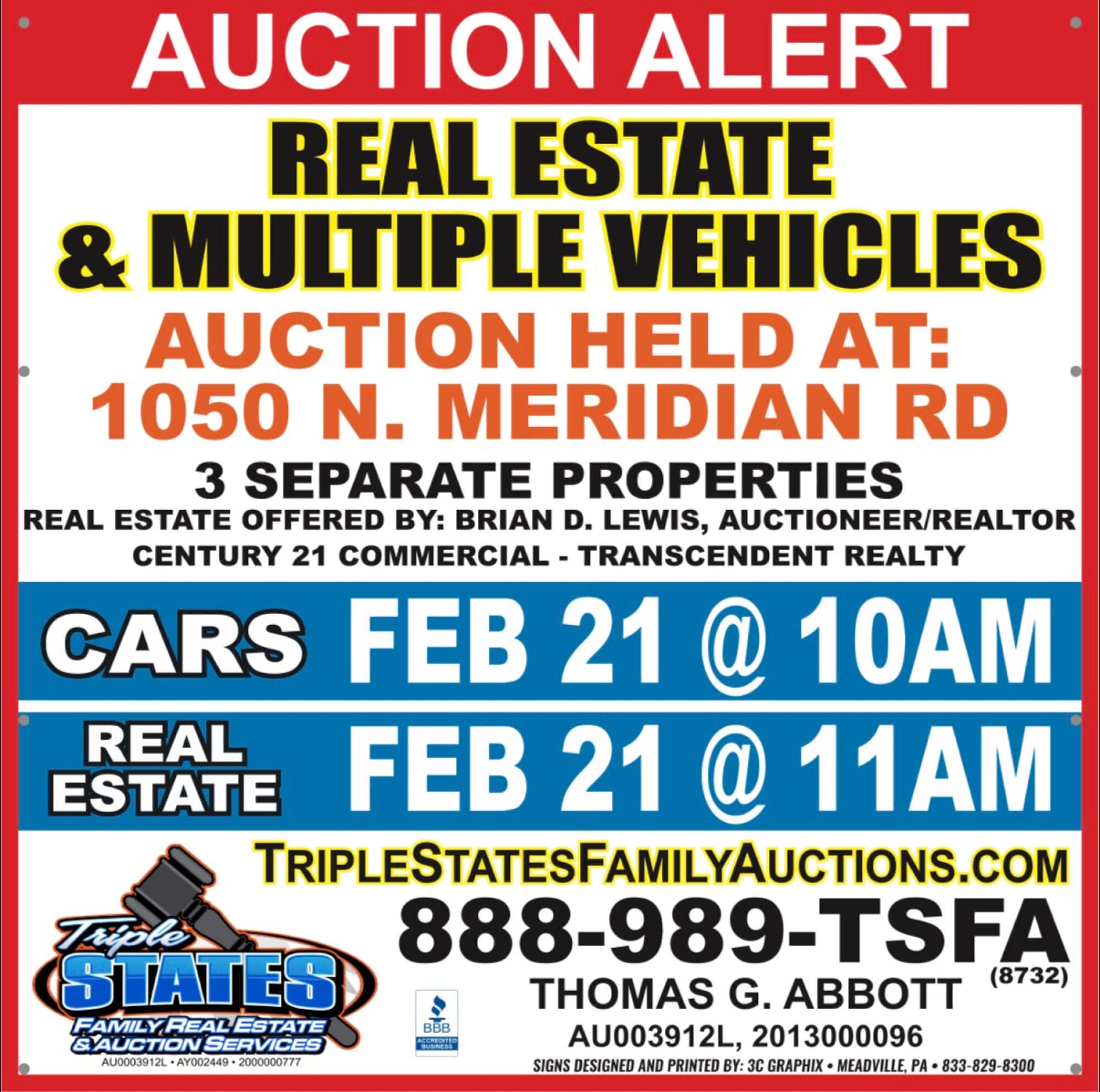 3 separate real estate properties will be auctioned off along with vehicles!!!